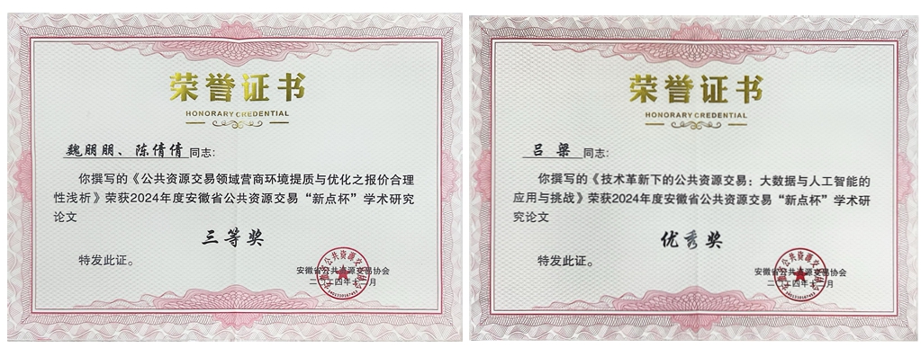 此外,公司选送的《公共资源交易领域营商环境提质与优化之报价合理性浅析》、《技术革新下的公共资源交易:大数据与人工智能的应用与挑战》论文荣获安徽省公共资源交易协会优秀论文三等奖和优秀奖,同时公司荣获“学术研究先进单位”称号,成为全市代理机构中学术创新的典范。